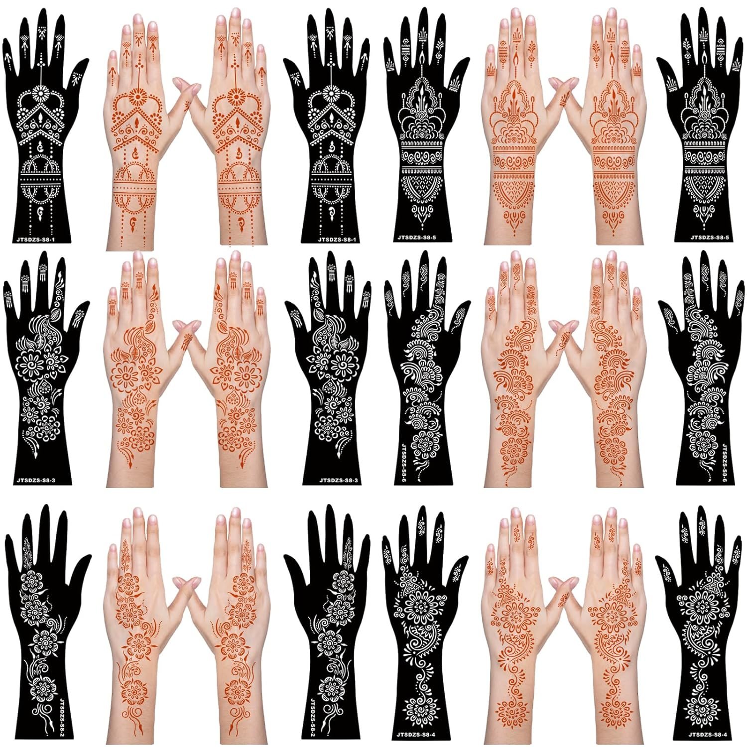 1 Set = 12 Sheets Henna Tattoo Stencils, 6 Pairs Right and Left hands stencils. Pasting position: Hand, Finger,Forearm, etc. Suitable for Henna tattoo, Airbrush Painting, Glitter tattoo, and so on;