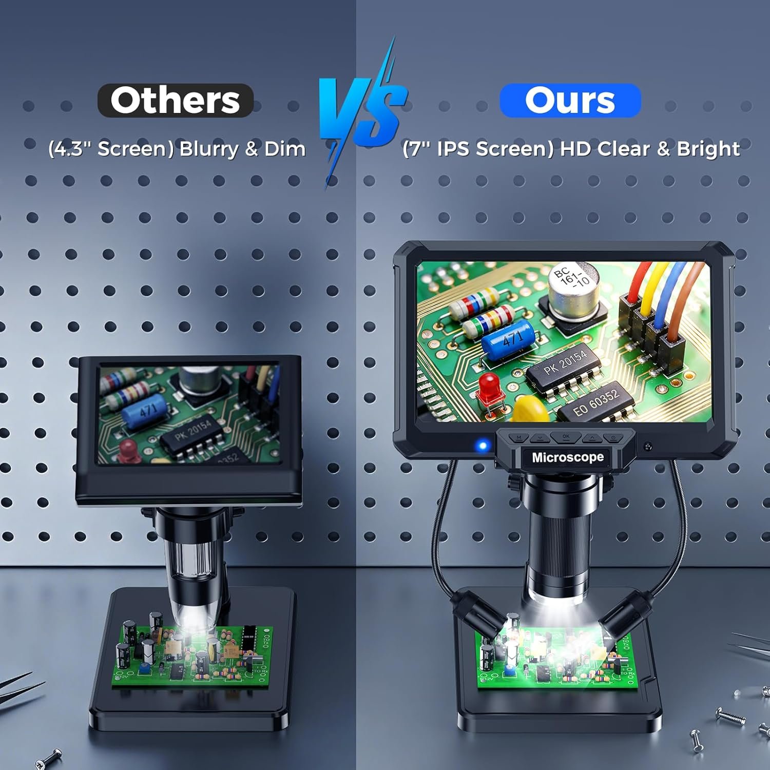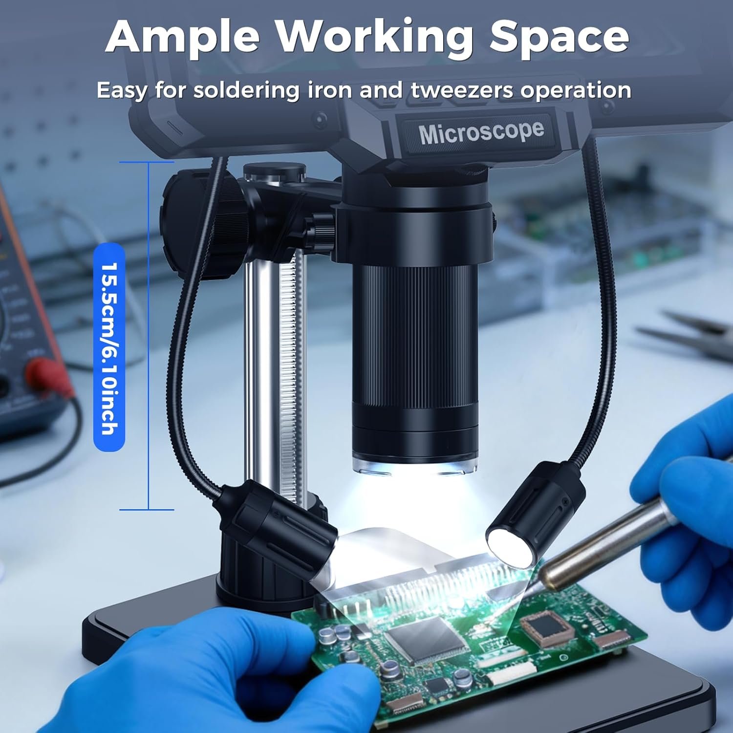 High-Clearance Stand for Soldering Irons: Unlike short stands that block tools, our adjustable height design provides ample working distance for soldering irons and tweezers. The 7-inch IPS Screen delivers lag-free 1080P feedback, allowing you to perform precision microsoldering on logic boards and inspect tiny SMD components (0201/0402 sizes) without hunching over