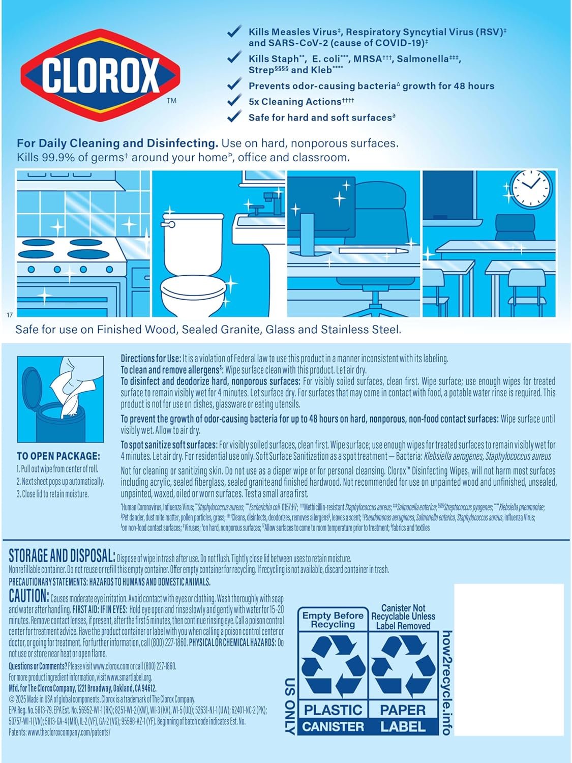 NEW SPARKLING SCENTS: Great for daily cleaning, Clorox Disinfecting Cleaning Wipes deliver an effective clean and sparkling scent with every wipe; packaging may vary.