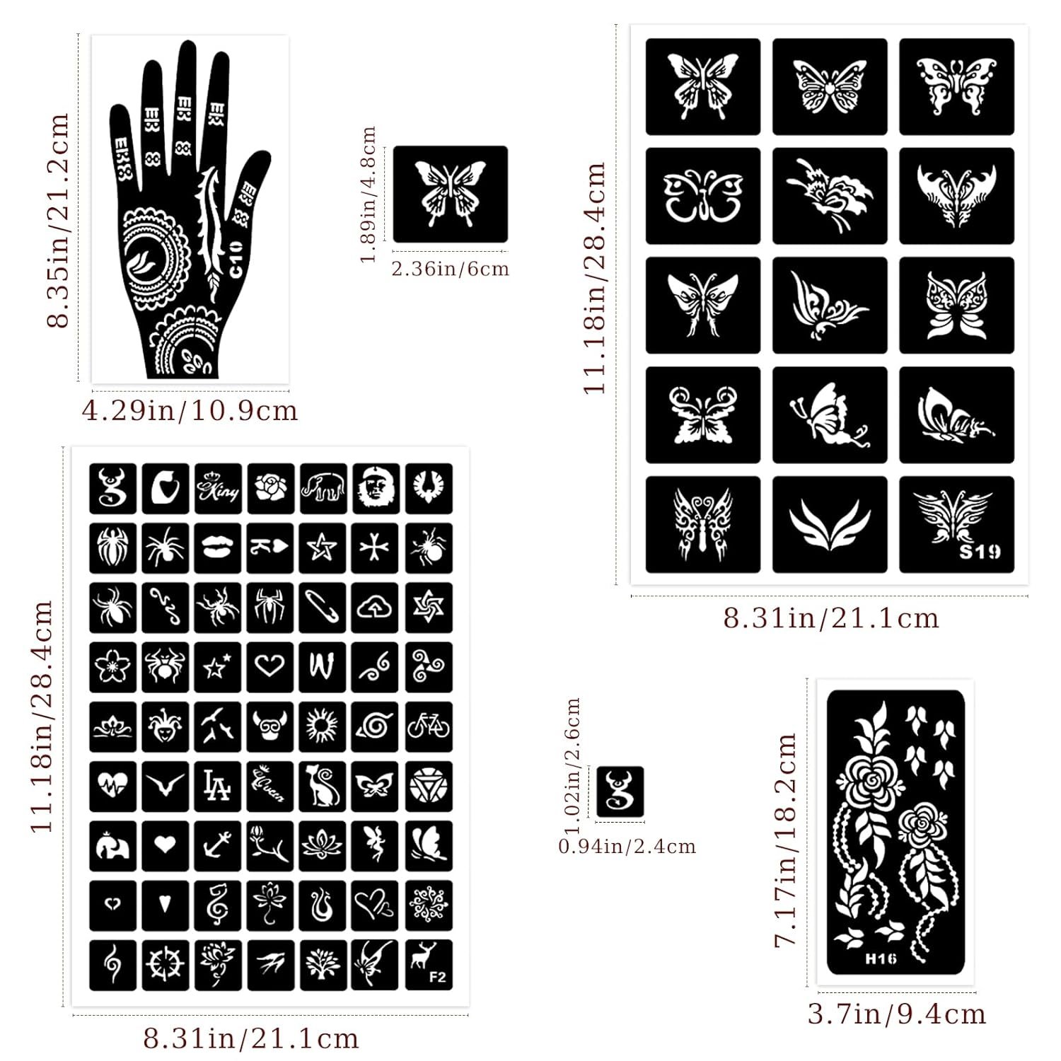 TEMPORARY TATTOO KIT ACCESSORIES – Contains 2 sheets of A4 size tattoo templates + 8 double henna templates for hand + 8 sheets of medium size tattoo templates. The template set is small and portable, allowing you to easily create temporary tattoos anytime, anywhere.