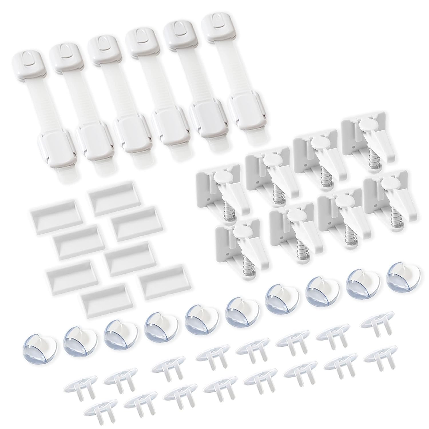 All-in-one Child proofing Kit: Ensure the safety of your kids (up to 5 years) at home, with the easy to install 4-in-one, baby proofing kit. It includes 6 adjustable safety latches, 8 invisible cabinet locks, 16 plug covers for electrical outlets, and 10 clear corner bumpers making it a perfect for new parents and baby shower gifting