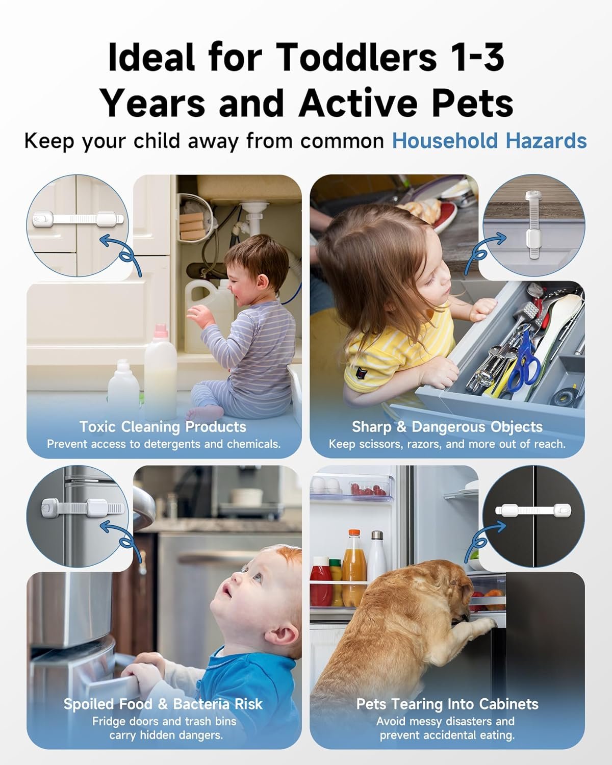 Durable, Child-Safe Materials – Crafted from high-quality, BPA-free materials, these baby proof cabinet locks are non-toxic, flexible, and built to withstand daily use while keeping curious kids away.