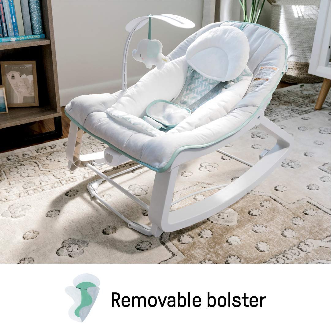 The best-selling Ingenuity Keep Cozy Baby Bouncer, Seat & Infant to Toddler Rocker grows with baby to be enjoyed for years. A new parent “must-have” with over half a million units sold, this baby rocker and bouncer from the #1 manufacturer of bouncers is designed in the USA and gives you a second set of hands while baby sits comfortably in your sight. Third party tested and approved, the Keep Cozy features 3 modes in 1: bouncing, rocking, or convert it to a stationary seat for your toddler with the kickstand at the rear. Packed with features like soothing vibrations powered by 1 C battery (not included), two reclining positions for baby’s comfort and a removable infant bolster that helps newborns sit securely. Includes a detachable plush elephant hanging toy for playtime at home or on the go. Neutral design blends into any home décor. Seat pad and bolster are machine washable. Accommodates children up to 40 pounds. So versatile, it makes a great add to your baby registry, too. Assembled dimensions are 24.41″ (H) x 19.49″ (W) x 26.38″ (D). This is the #1 bouncer, Circana, Retail Tracking Service, Bouncers, U.S. dollar sales, January-November 2023 combined.