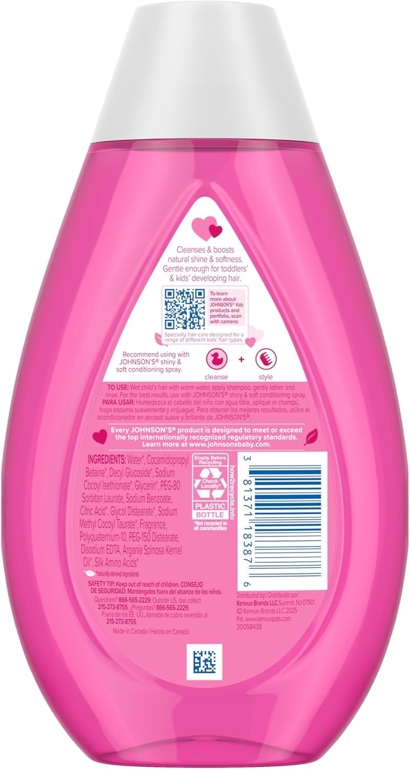 Cleanse your kid’s and toddler’s delicate hair and boost natural shine with Johnson’s Shiny & Soft Shampoo. Enriched with argan oil and silk proteins, this children’s smoothing shampoo gently cleanses and leaves hair with long-lasting shine and softness. This gentle shampoo is formulated to be milder than adult products and designed for a range of different kids’ hair types, making it ideal for toddlers’ and kids’ developing and changing hair. Its unique formula is ophthalmologist and pediatrician tested and is made with a No More Tears formula that is as gentle to the eyes as pure water. Johnson’s shampoo is hypoallergenic and contains no added parabens, sulfates, or dyes. Every Johnson’s product is designed to meet or exceed the top internationally recognized regulatory standards. For best results, follow with Johnson’s Kids’ Shiny & Soft Conditioning Spray. To use, wet your child’s hair, apply shiny hair shampoo, gently lather, and rinse.