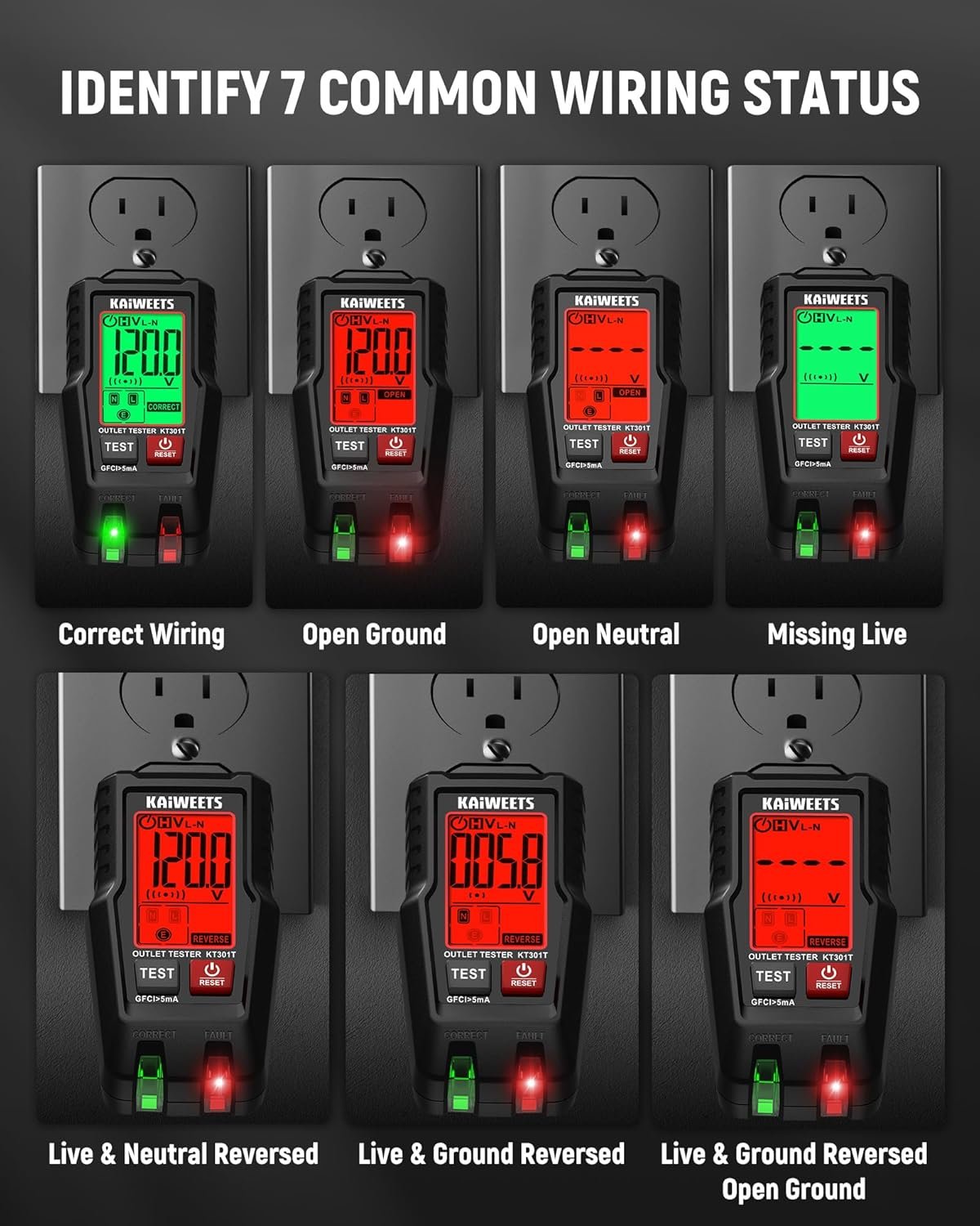 GFCI OUTLER TESTER: Quickly identifies wiring issues.Features an easy-to-read LCD screen that displays real-time voltage readings alongside clear wiring status icons. Bright red and green LED indicators ensure quick, accurate results at a glance, even in dimly lit environments. Built-in GFCI test function ensures your ground fault protection devices are working properly