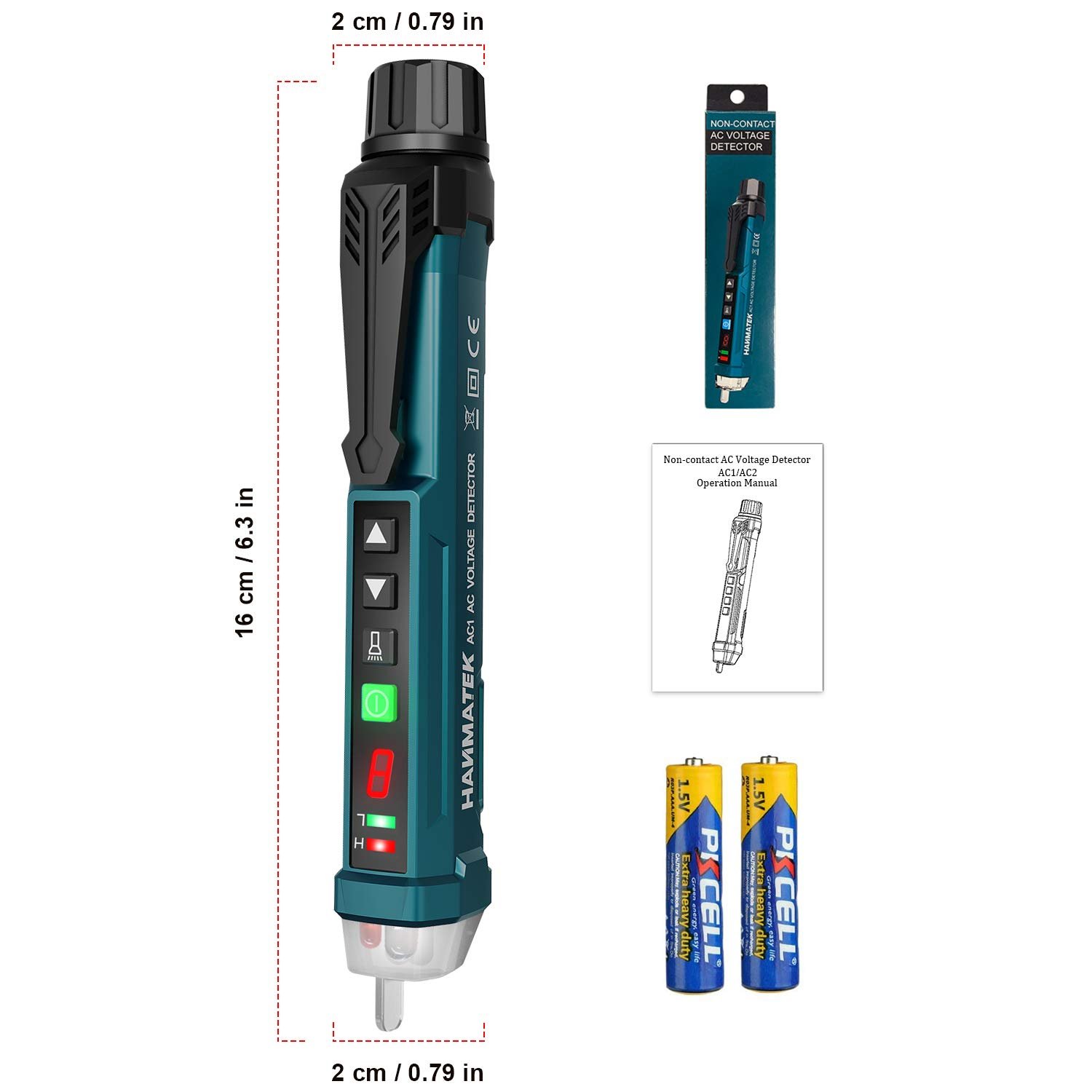 [Auto Power off Function]: If there is no operation within 3 minutes and the test pen does not detect the AC voltage, the test pen will shut down automatically. The package is equipped with a contactless stylus, a manual, and two 1.5V AAA batteries.