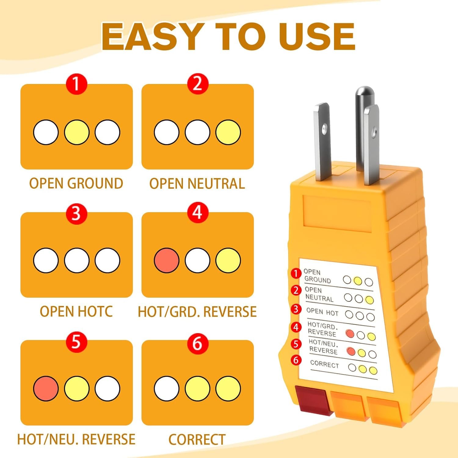 This receptacle tester combines practical design with durability: its compact size fits easily in toolboxes or drawers, while the hi-impact resistant hardened plastic housing and textured sides (for secure grip) make it durable enough for long-term use. Even accidental drops won’t easily damage this electrical tester, ensuring it’s a reliable tool for years.​