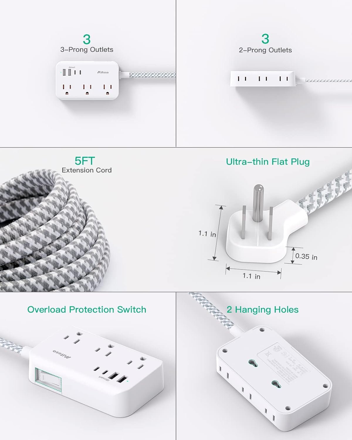 【5Ft Power Cord & Mountable Design】- The braided fabric makes it tangle-free and more flexible, while also adds a decorative touch to any room space. This mount power strip can be fixed on the wall or desk by 2 keyhole slots on the back.